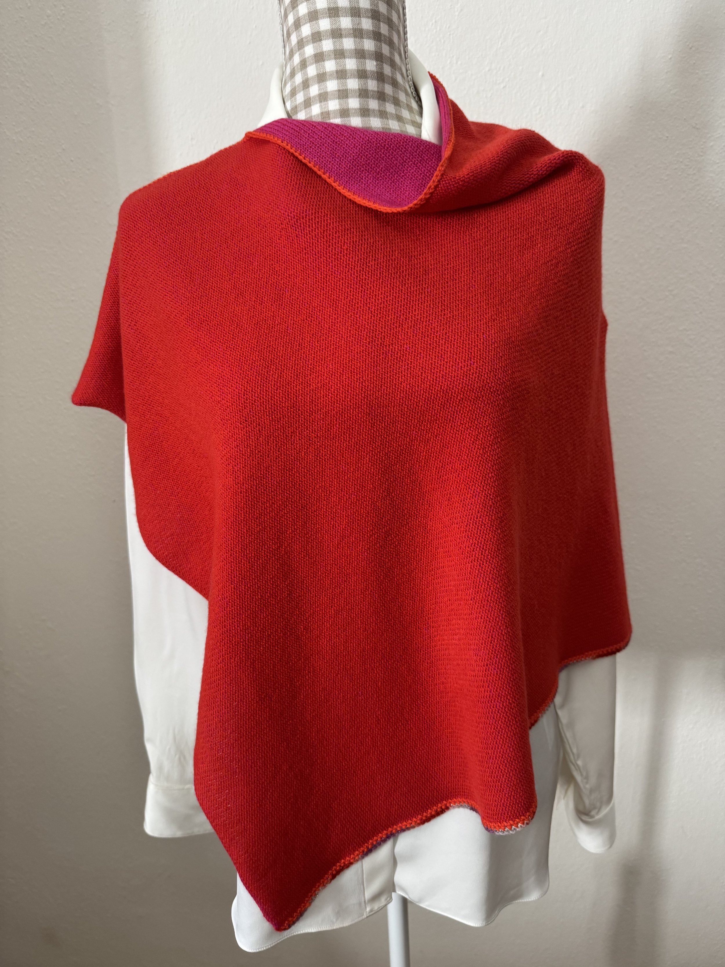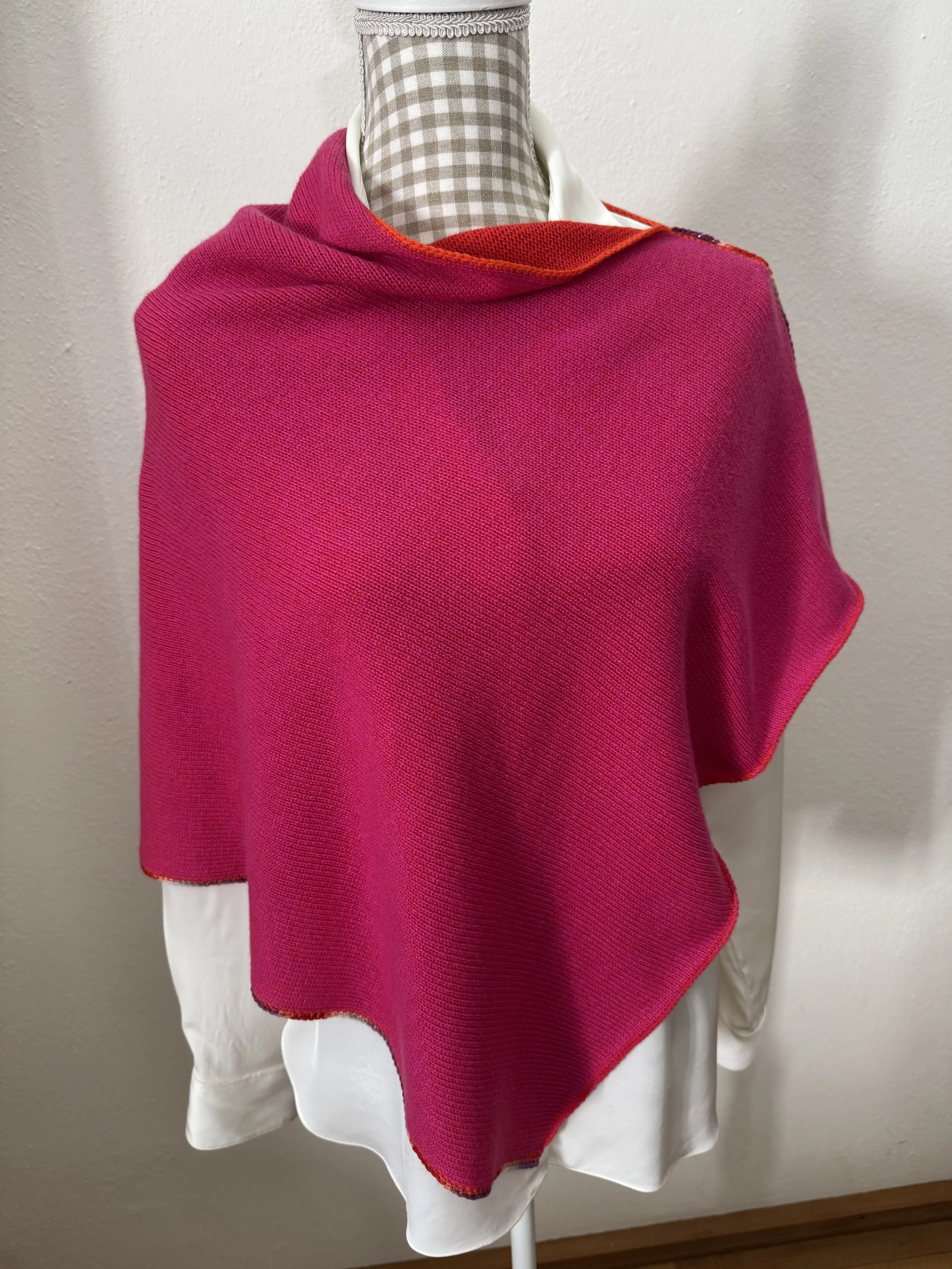 Der Poncho süße Maus wird plattiert ( zweifarbig Vorder/Rückseite) auf der Maschine gestrickt und danach umhäkelt mit zwei Kontrastfarben. Die äußere Reihe besteht aus Mäusezähnchen,-